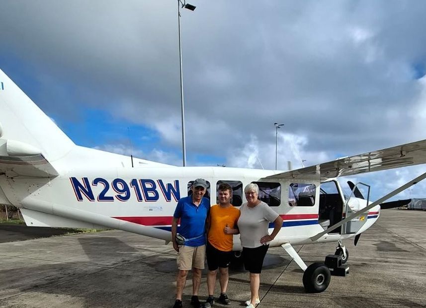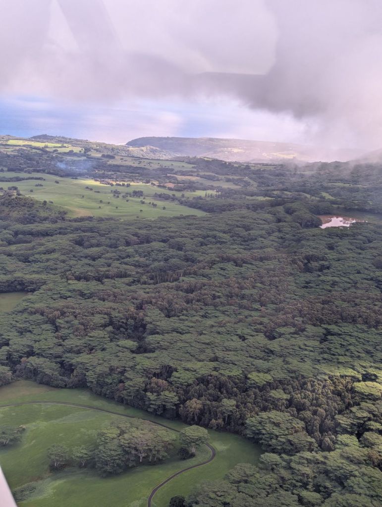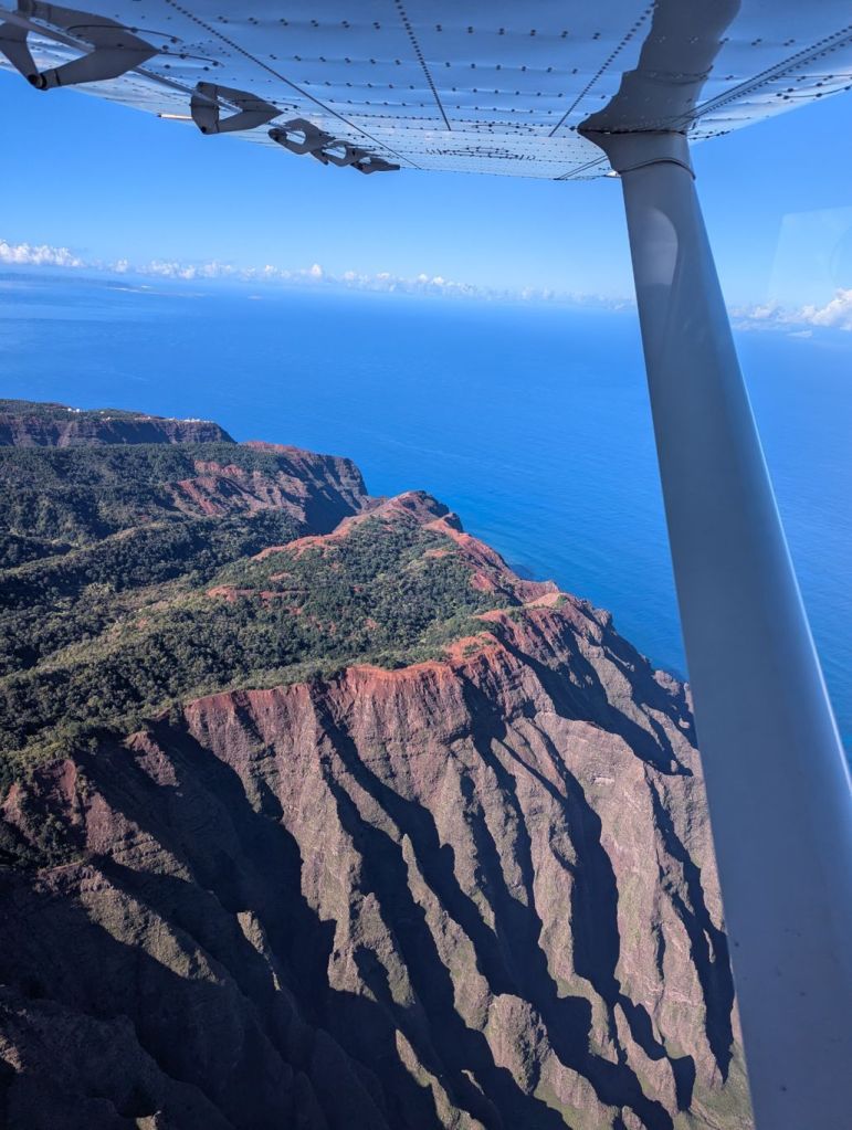 Als Highlight unseres Aufenthaltes wollten wir Kauai aus der Luft erleben, bei einem Rundflug mit ‚Wings over Kauai“. Der kleine Flieger startete vom Haupt-Flughafen Līhuʻe und bot schon kurz nach dem Abheben einen wunderbaren Blick über die Küste, die Berge und die grünen Täler der Insel aus der Vogelperspektive. Der Flug führte entlang der Südküste, über den Waimea Canyon und weiter zur Nā Pali Coast, deren steile Felswände besonders eindrucksvoll wirken. Diesen Teil der Insel kann man nur per Flieger oder über das Wasser erreichen. Auch Hanalei Valley und die dicht bewachsene Inselmitte waren gut zu sehen. Die Sicht war heute klar, nur in höheren Lagen hingen einige Wolken, wie für Kauai typisch. Kamaka, der junge Pilot erklärte uns die wichtigsten Orte und Besonderheiten seiner Insel mit einer gewissen Begeisterung. Kamaka ist in dem Ort in dem wir auf Kauai wohnten aufgewachsen und lebt dort.