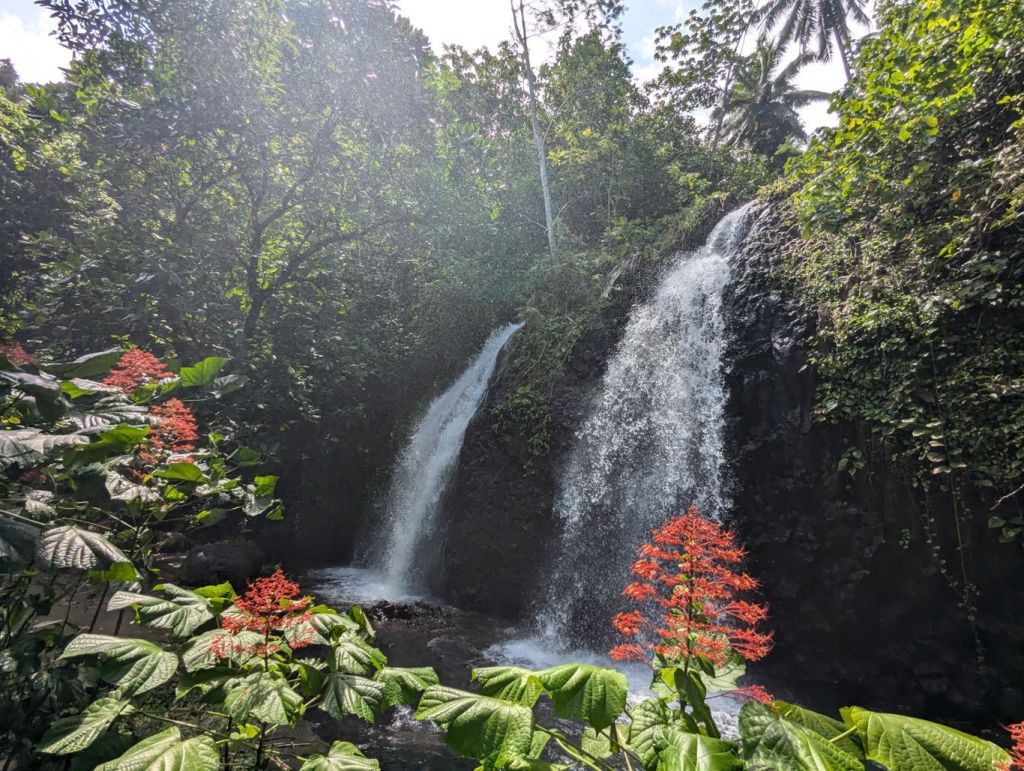 Einen Stopp legten wir am Vaihi Wasserfall ein, sehr schön im dichten tropischen Grün gelegen. Danach kamen unsere Schwimmsachen noch zum Einsatz. Pointe Venus ist ein schwarzer Sandstrand mit feinem Sand, Duschen und tollen Ausblick auf die Berge. Nach dem Baden kehrten wir nach Papeete zurück.