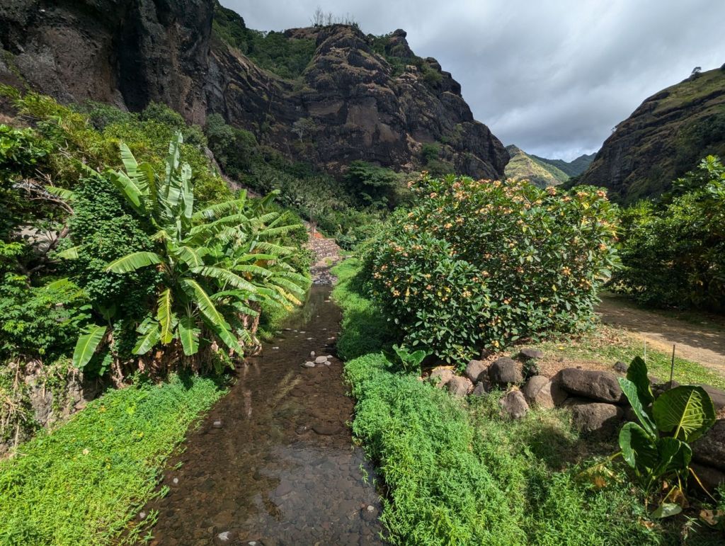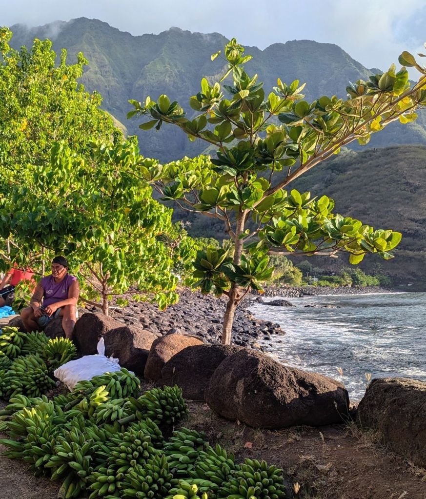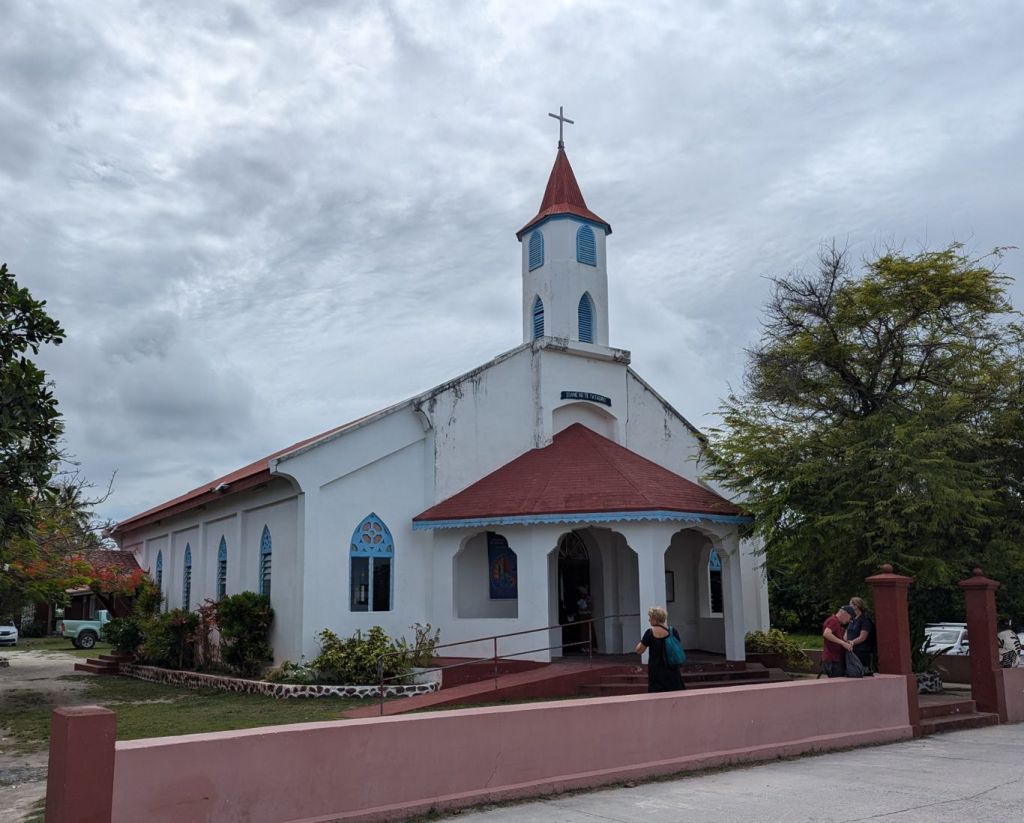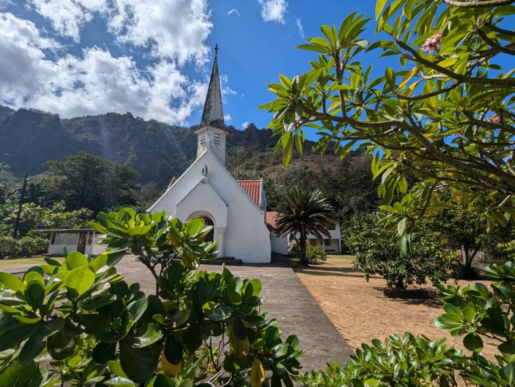 Von hier aus spazierten wir dann die Straße talaufwärts. Omoa empfanden wir als das schönste Dorf der Marquesas Insel. Gepflegte Grundstücke und schöne Gärten mit vielen Obstbäumen. Hier natürlich Manga, Papaya, Kokosnus oder Bananen. Einige Bewohner boten am Straßenrand Früchte oder selbstgefertigte Produkte an. Natürlich gibt es im Omoa auch eine Kirche und zwei kleine Läden. Die dort angebotenen Produkte sind über Wochen die einzige Versorgungsmöglichkeit für die Inselbewohner. Amazon liefert hier nicht. Als wir die Dorfstraße zurück gingen kamen uns immer wieder Pickups entgegen, die Waren von der Aranui abgeholt hatten. Auch ein voll beladener Gabelstapler war dabei. Der fuhr vom Beach direkt zum kleinen Supermarkt.