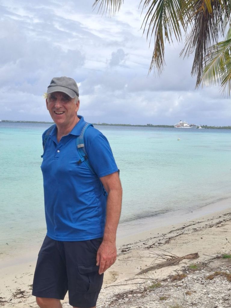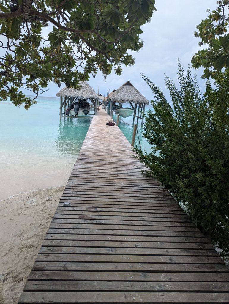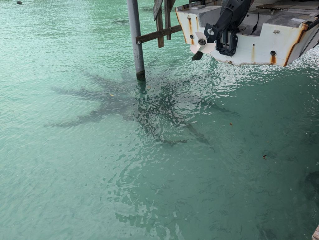 Samstag Vormittag ging es aufs Schiff. Da es nur ca. 160 Gäste waren lief alles ruhig und entspannt ab. Nachdem wir die Kabinen bezogen hatten, gab es zur Begrüßung noch eine Aufführung einer Tanzgruppe aus Tahiti. Zwischendurch wurden auch Gäste aufgefordert mitzutanzen. Natürlich traf es mich. Ich gab mein Bestes! Sonntag Morgen legte die Aranui als erste Station im Atoll Fakarava, etwa 450 km nordöstlich von Tahiti, tief im Herzen der Tuamotu-Inselwelt an. Fakarava ist das zweitgrößte Atoll Französisch-Polynesiens (nach dem Atoll Rangiroa), mit einer riesigen Lagune und nur wenigen Landflächen. Fakarava wurde wegen seines ökologischen Werts von der UNESCO als Biosphärenreservat anerkannt. Das bedeutet: Die Natur ist besonders geschützt, die Insel bietet Korallenriffe und Lagune in fast unberührtem Zustand. Das Atoll ist ein schmaler  Ring mit einem sogenannten Pass, in den das Schiff einfährt und dann vor dem Hauptdorf Rotoava ankert. Mit den beiden Beibooten wurden wir ausgeschifft. Das Dorf besteht aus ein paar Häusern, einer Tankstelle, einer kleinen Kirche und einfachen Läden. Wir wanderten am Ufer entlang zu einer kleinen Hotelanlage. Hier gibt es die Besonderheit, das die Sonnenschirme, Tische und Bänke im Wasser stehen. Bei einem Drink im Wasser schwimmen dann die Haie zwischen den Gästen umher. Sonntag Vormittag hatte die Bar noch geschlossen und ca. 10 Haie hatten sich sternförmig um einen Pfeiler des nahen Stegs gereiht. Wir hatten Bade- und Schnorchelausrüstung dabei und nutzen den traumhaften Strand. Mittags ging es zurück und die Aranui legte ab Richtung Marquesas Inseln. Für Montag stand ein kompletter Seetag auf dem Programm.