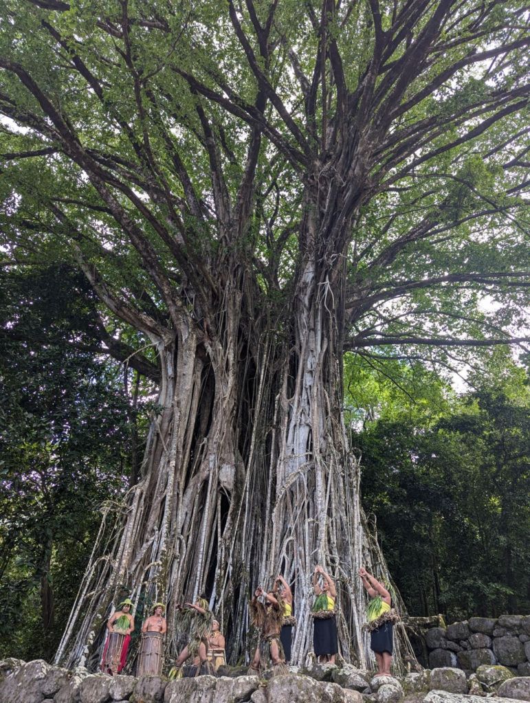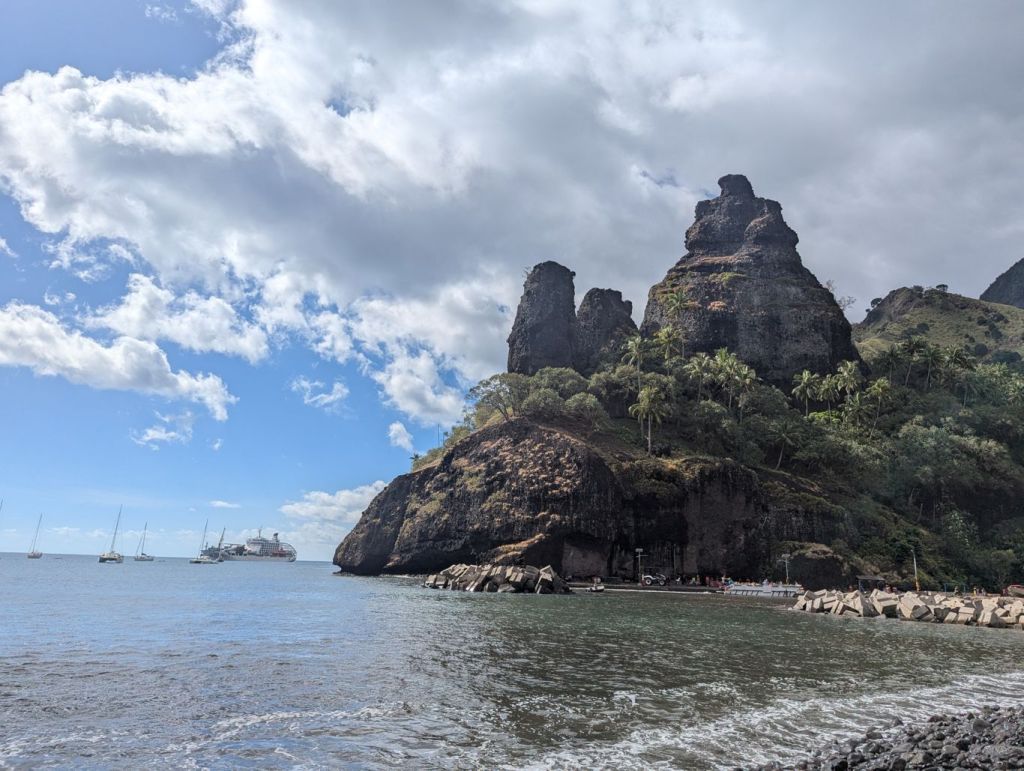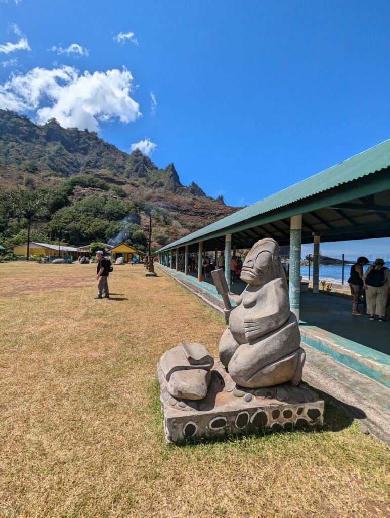 Jörg, der Guide für die deutschsprachigen Gäste an Bord, hatte uns am Seetag viel über die Geschichte und Kultur der Marquesas berichtet. Er lebt schon seit 20 Jahren auf Tahiti und ist mit einer Frau von Nuka Hiva verheiratet. Mit Pickups fuhren wir quer über die Insel. Unser Pickup hatte auch Sitzplätze auf der Ladefläche. Ein Traum für Luca. Die Straßen winden sich durch üppige Vegetation, vorbei an verstreuten Häusern und immer wieder mit Blick auf das Meer. Nach einigen Zwischenstopps machten wir halt an der Kultstätte „Ensemble Tahakia Kamuihei Teiipoka“. Dort erlebten wir eine Tanzvorführung, kraftvoll, rhythmisch und mit einer Energie, die zeigt, dass Tradition hier nicht nur Touristen Show, sondern auch wiederbelebte Kultur ist. Regelmäßig treffen sich die Bewohner verschiedener Inseln zu eigenen Art Festivals. Zum Mittagessen ging es weiter nach Taipivai, ein Tal, dass durch Herman Melvilles Roman „Typee“ bekannt wurde. Im Dorf gab es ein einfaches, aber köstliches Essen, frischer Fisch, Gemüse, Früchte und Schwein aus dem Erdofen, eine Spezialität der Südsee Inseln. Am Abend erwartete uns an Bord der Aranui ein polynesischer Abend mit Musik, Tanz und Blumenkränzen.  Ein lebendiger Ausklang eines intensiven Tages.