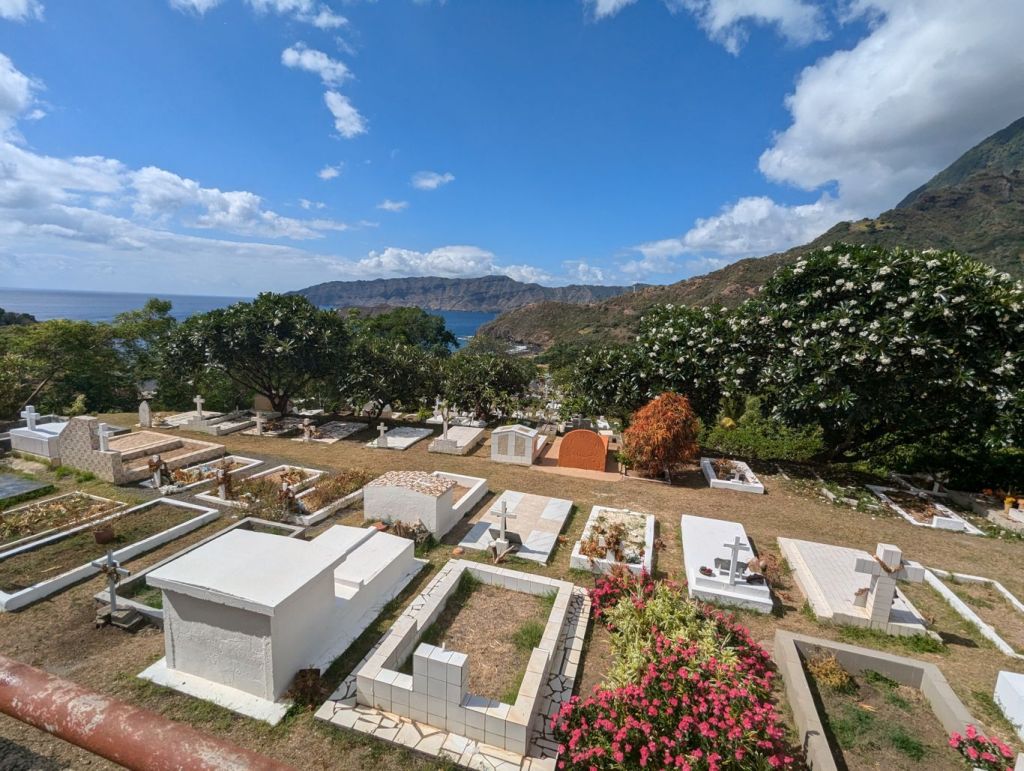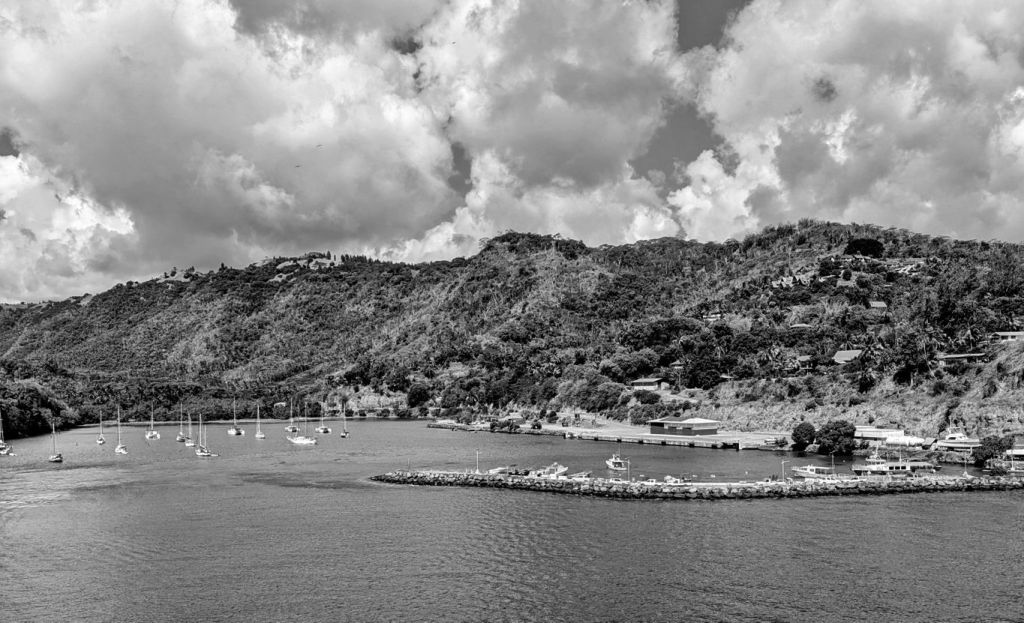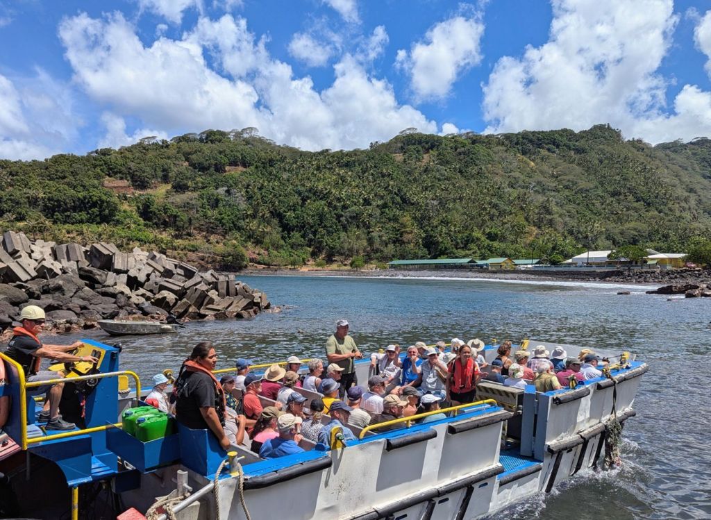 Am Morgen machten wir im kleinen Hafen von Hiva Oa fest. Der Hauptort Atuona liegt in der Nachbarbucht. Ich schloss mich der Wandergruppe an, die über den dazwischen liegenden Berg ging. Für die anderen Gäste fuhr der Bus zum Dorf. Die Wanderroute führte an dem über der Bucht von Atuona liegenden Friedhof vorbei. Hier findet man die Gräber des Malers Paul Gauguin und des Chanson Sängers Jacques Brel. Deren Namen sind fest mit der Insel verbunden, da sie einige Zeit auf der Insel lebten. Unten im Dorf gibt es zu den Künstlern jeweils ein kleines Museum. Nachdem Mittag ging es schon wieder weiter. Vom Oberdeck beobachteten wir gespannt das nicht ganz einfache Wendemanöver, um dem kleinen Hafen wieder zu verlassen. Ab jetzt sollte es keinen Hafen auf den kommenden Inseln mehr geben. Die Aranui ankert dann in einer Bucht und es beginnt das interessante Löschen der Ladung mit kleinen Ponton Booten und die Ausschiffung der Gäste mit der Barge.