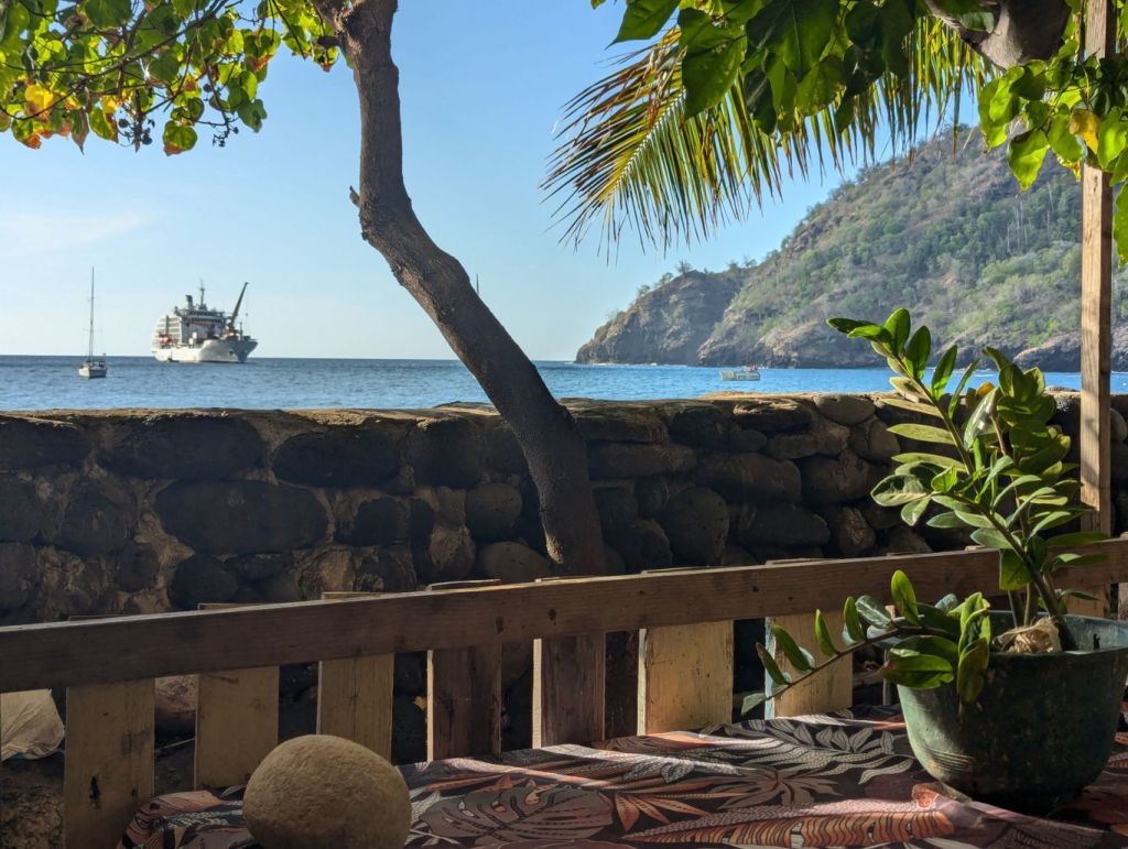Die kurze Fahrt von Hiva Oa führt durch eine Meerenge hindurch nach Tahuata. Bei schönstem Wetter hat man immer wieder den Blick auf kleine Buchten mit Sandstrand und Palmen, die aber nur über das Meer erreichbar sind. Sobald wir die Bucht von Tahuata erreicht hatten hörten wir sofort das Rattern der Ankerkette und die beiden Krähne wurden in Gang gesetzt. Unverzüglich begann das Entladen und ausschiffen. In der Bucht liegt der kleine Ort Vaitahu. Auch auf dieser Marquesas Insel  ist das Eintreffen der Aranui ein großes Ereignis und willkommene Abwechslung für die wenigen Bewohner. Es gibt dann immer einen extra aufgebauten Markt mit Tanz und Musik. Wir trinken etwas in der kleinen Snack Bar am Strand. Ein bunt angemalter alter Wohnwagen, ein einfaches Vordach, ein paar Plastikstühle direkt am Meer und freundliche, hilfsbereite Menschen.
