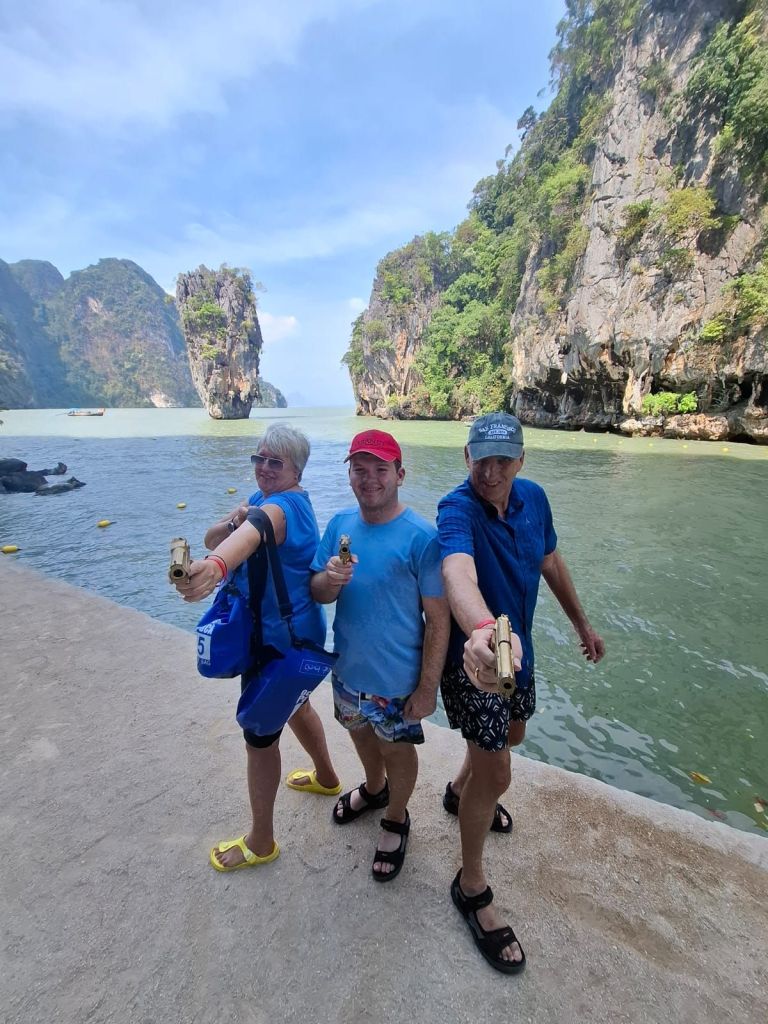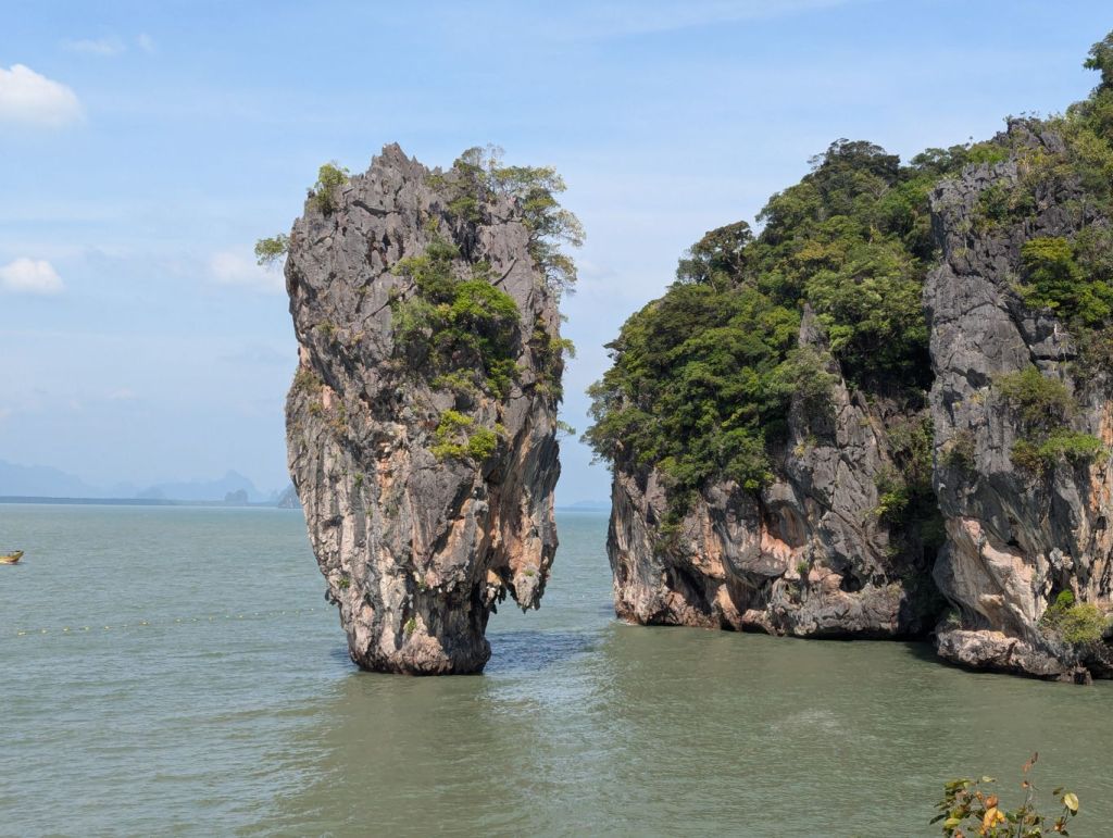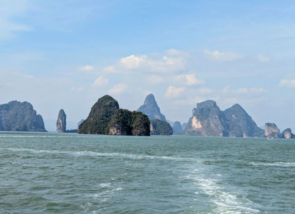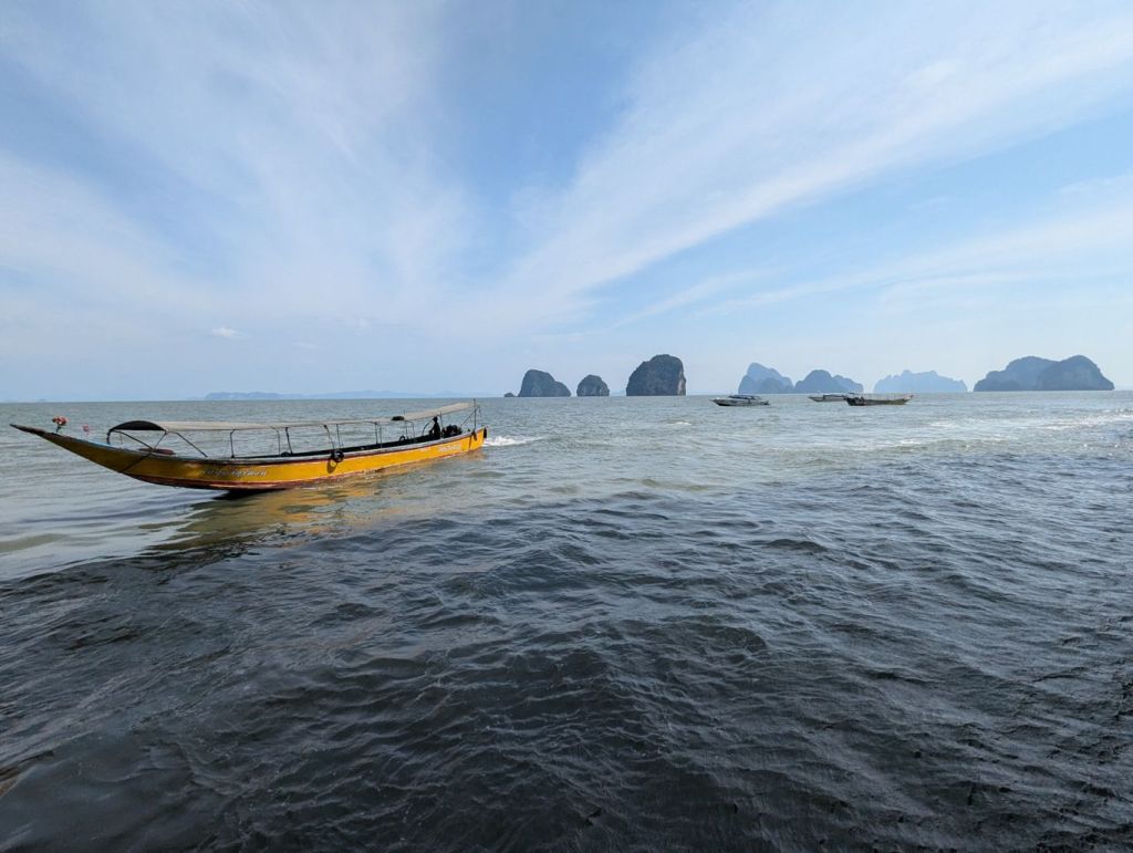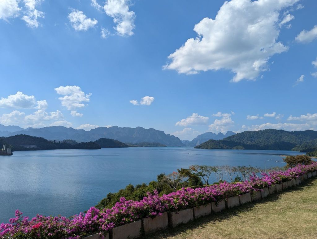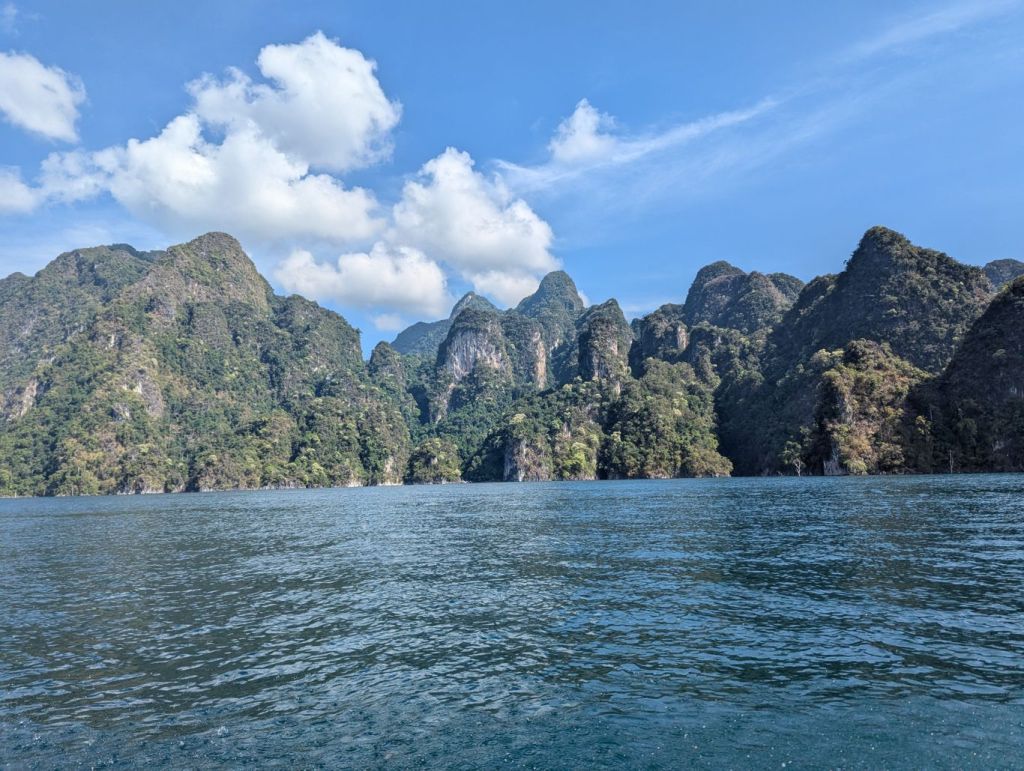 Am Ratchaprapha Dam angekommen, wechselten wir auf ein Longtailboot und fuhren über den Ratchaprapha-Stausee. Der See entstand in den 1980er-Jahren durch den Bau eines Staudamms zur Stromerzeugung und Wassergewinnung. Große Flächen wurden damals überflutet, zurück blieb eine heute einzigartige Landschaft aus Wasser, Dschungel und steil aus dem See aufragenden Kalksteinfelsen. Ein sehr verzweigter See mit einer Größe von rund 165 Quadratkilometern. Die Landschaft erinnert an Filmwelten wie Avatar, auch wenn hier kein Drehort liegt. Zwischendurch legten wir am einer Tropfsteinhöhle und zum thailändischen Mittag an einem schwimmenden Hotel an. Ein weiterer Halt war die Badestelle der hier freilebenden Elefanten. Wir konnten sie ufernah im Unterholz hören, sie ließen sich aber leider nicht blicken.
