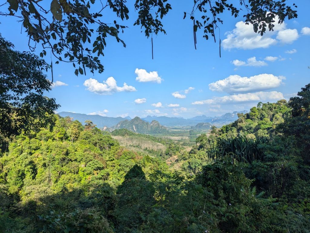 Von Khao Lak aus ging es früh morgens mit dem Minibus ins Landesinnere zum Khao Sok Nationalpark, einem der ältesten Regenwaldgebiete der Erde. Der Khao Sok Nationalpark ist geprägt von dichtem, ursprünglichem Regenwald, steilen Kalksteinfelsen, Flüssen und Seen. Teile dieses Waldes sind älter als der Amazonas und gehören zu den artenreichsten Regionen Thailands. Elefanten, Gibbons, Nashornvögel und zahlreiche Reptilien leben hier, auch wenn man die meisten eher hört als sieht. Auf der Fahrt dorthin fiel uns auf, dass außerhalb dieser Schutzgebiete das Land überwiegend landwirtschaftlich genutzt wird, wobei Ölpalmen und Kautschuk die wichtigsten Kulturen sind. Besonders der Anbau von Ölpalmen nimmt seit Jahren zu, da Palmöl ein bedeutender Rohstoff für Lebensmittel, Kosmetik und Energie ist und den besten Erlös erbringt. Am Straßenrand sahen wir auf der Fahrt viele frisch angelegte Ölpalm Plantagen. Der Übergang zwischen Regenwald und Plantage ist oft abrupt. Während Nationalparks streng geschützt sind, wurden frühere Misch- und Sekundärwälder bereits vor Jahrzehnten umgewandelt. Dadurch entsteht für Reisende ein scheinbar einheitliches „grünes“ Landschaftsbild, das ökologisch jedoch stark unterschiedliche Lebensräume umfasst.