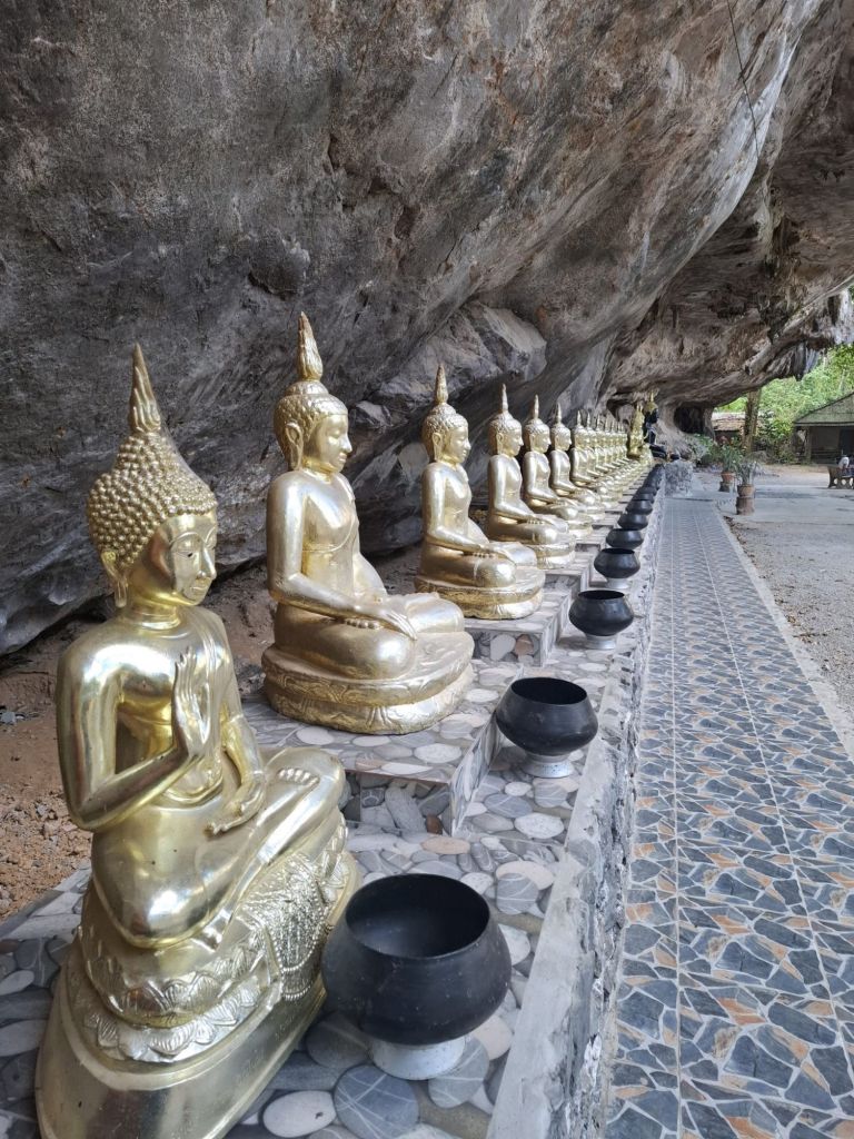 Auf der Rückfahrt mit dem Van machten wir Halt an einem Felsentempel, eingebettet in Kalksteinwände. Am vorbeifließenden Fluß werden von den Besuchern die Fische gefüttert, die sich dann zu Tausenden einfinden. Ein spannender Ausflug, der uns die vielfältigen Landschaften von Thailand zeigte.