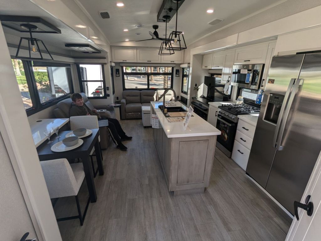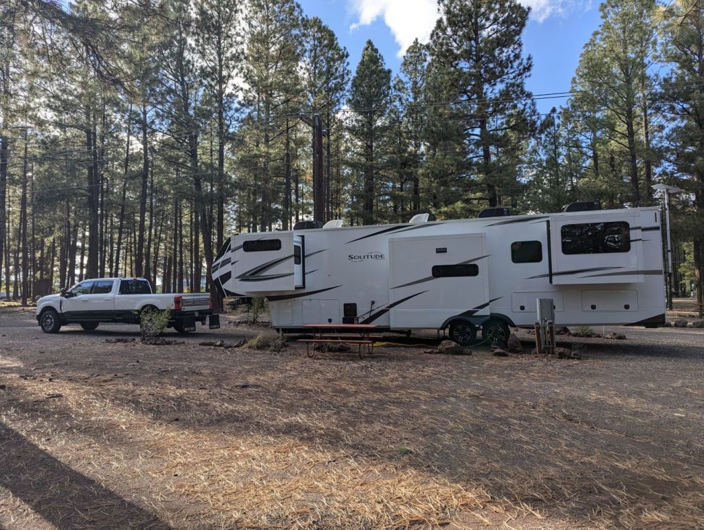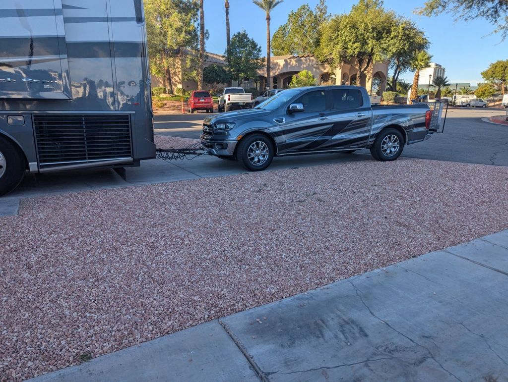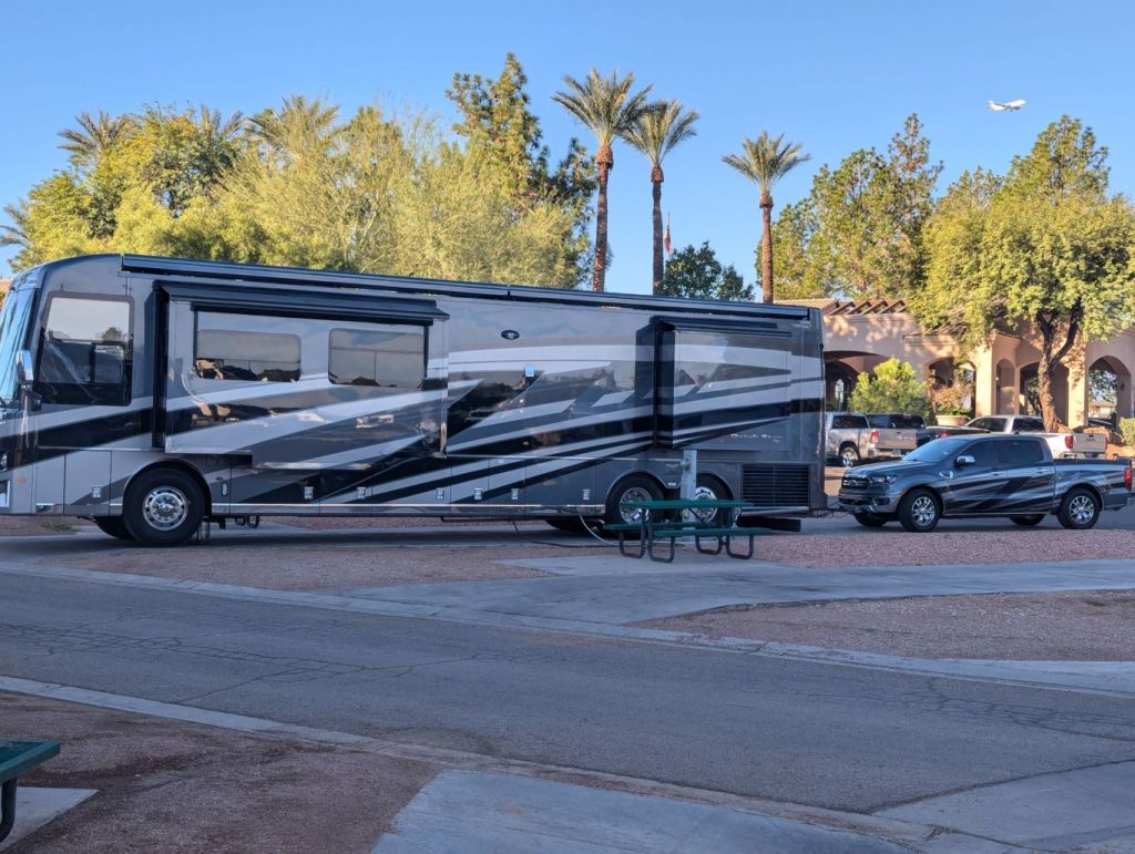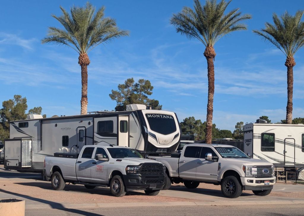 Bei unserem Trip merken wir wie selbstverständlich das Leben mit Wohnmobil, Bus oder Trailer hier ist, nur oftmals in ganz anderen Dimensionen. Auf dem Highways und auf den Campingplätzen begegneten uns riesige Busse mit glänzender Chromfront, klassische Airstream-Wohnwagen aus Aluminium – und sehr häufig Pickups mit mächtigen Aufliegern, die fast wie rollende Ferienhäuser wirken. Und der Pickup ist nur selten ein Ford Ranger, den man auch bei uns ab und zu sieht sondern die großen Modelle von Ford, RAM oder GMC. In jedem zweiten Haushalt in den USA gibt es einen Pickup. Die Campingfahrzeuge sind von ihren Dimensionen schon breiter als in Europa. Trotzdem gibt es fast kein Gefährt ohne Slide Out. Und damit man auf dem Campingplatz mobil bleibt wird mit einem Deichselsystem das Auto hinter das Wohnmobil gehängt. In vielen Fällen ein Jeep oder ein Pickup. Ein irres Bild wenn hinter dem riesigen Campingbus in kurzem Abstand das Auto hinterherrollt und das mit der maximal zulässigen Höchstgeschwindigkeit auf dem Highway. Die Straßen der USA sind auf diese Giganten vorbereitet: breite Spuren, große Kurvenradien und riesige Tankstellen. Wir kamen uns mit unserem Wohnmobil neben den Riesen oft recht klein vor.