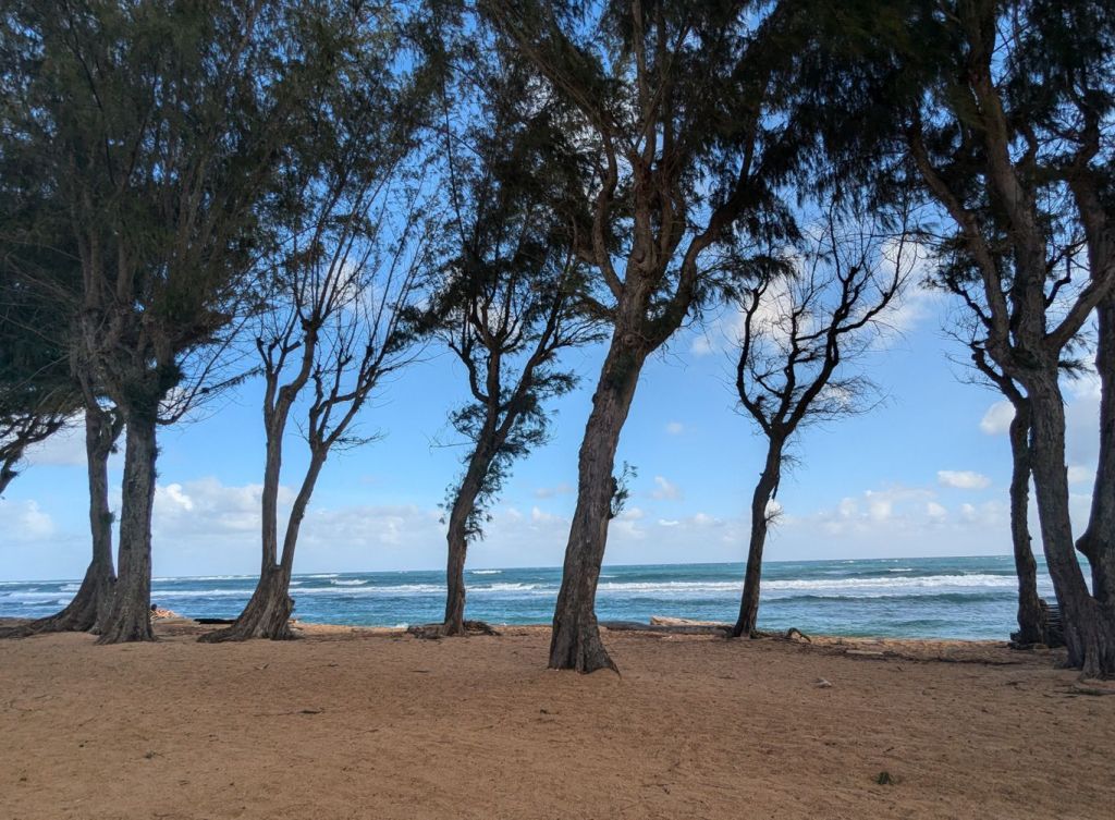 An der Nordküste angekommen halten wir an einigen Stränden an. Hier weht heute ein starker Wind. Die Surfer sind bei den hohen Wellen in ihrem Element. Am Maeaea Beach entdecken wir Meeresschildkröten die scheinbar  in den Wellen dümpeln. Auch am Laniakea Beach sind die Wellen so hoch, dass Schwimmen verboten ist. Kuilima Cove ist eine geschützte Bucht. Hier konnten wir dann ins Wasser springen, doch genau zu diesem Zeitpunkt gab es einen Regenschauer. Unsere Klamotten waren somit auch nass. Aber bei diesem Temperaturen kein Probleme. Auf dem Weg zum Strand waren wir noch an einer Möchsrobbe, die sich im Sand ausruhte, vorbeigekommen.
