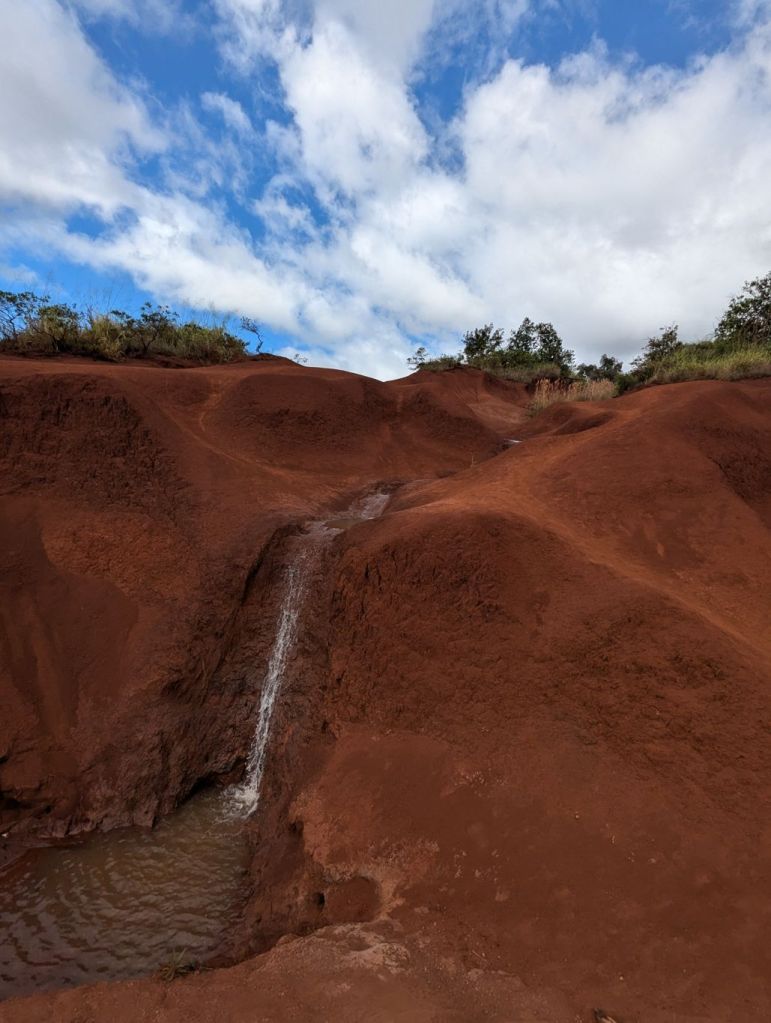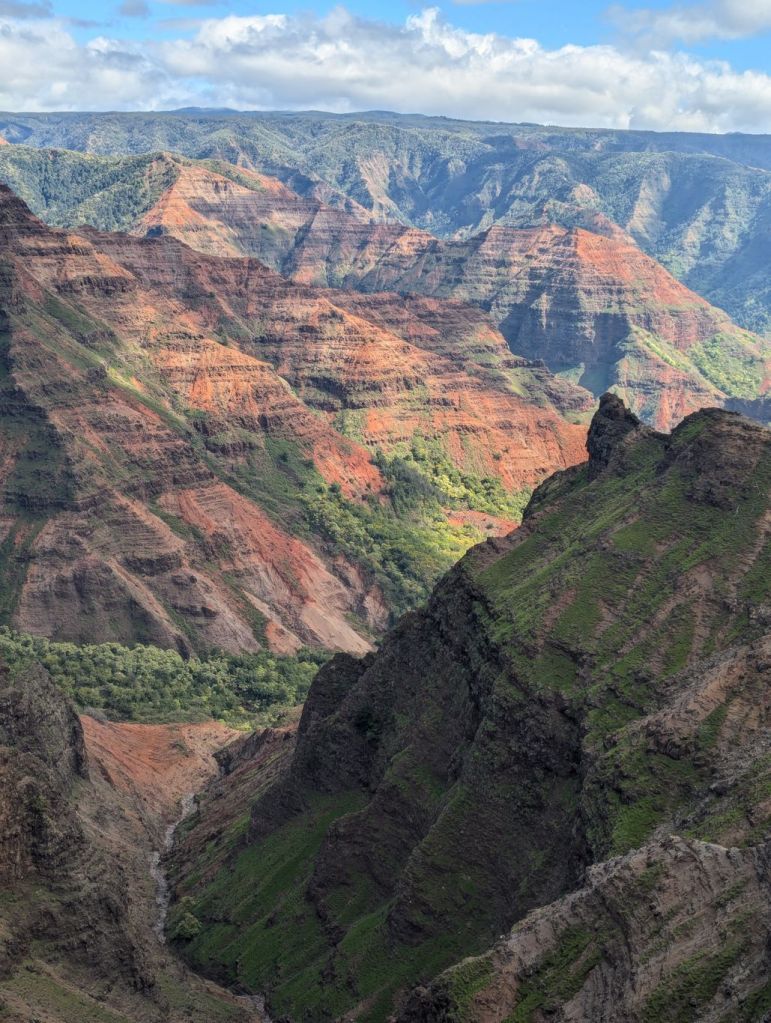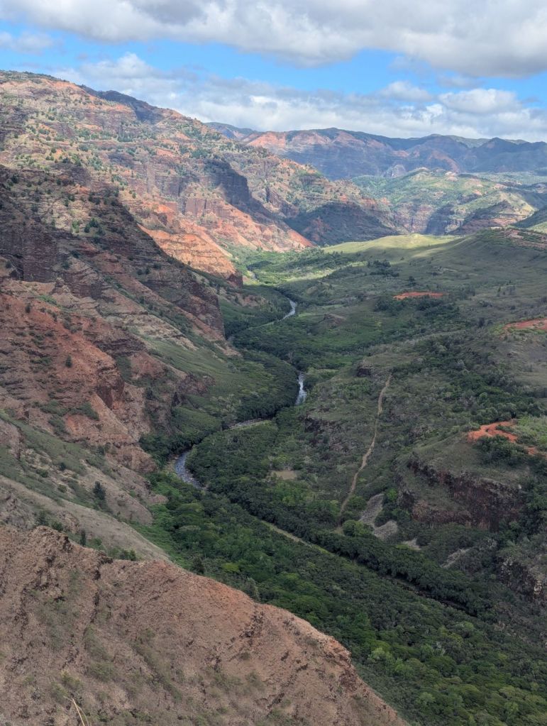 Der Great Canyon des Pazifik auf der Westseite Kauais ist etwa 22 Kilometer lang, bis zu 900 Meter tief und rund 1,5 Kilometer breit. Entstanden ist er durch den Einsturz einer Vulkanflanke sowie durch die jahrtausendelange Erosion des Waimea River, der die Landschaft immer weiter ausgespült hat. Die markante rotbraune Farbe der Felsen stammt von stark verwitterter, eisenhaltiger Vulkanerde.