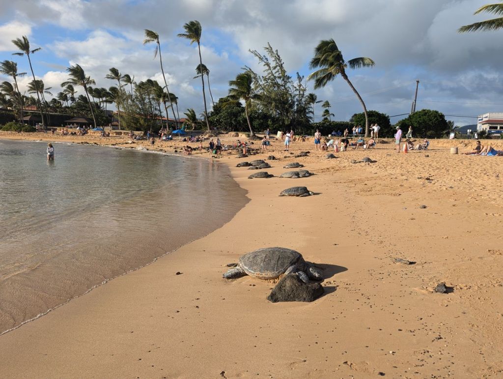 Montag ist erstmal wieder Waschtag. Doch am Nachmittag machen wir uns auf zum Poipu Beach. Hier sollen nachmittags die Schildkröten an den Strand kommen. Und tatsächlich, die Fahrt hat sich gelohnt. Eine große Anzahl der grünen Meeresschildkröten liegen wie die Badegäste am Strand in der Sonne und ruhen sich aus. Was für ein Bild!