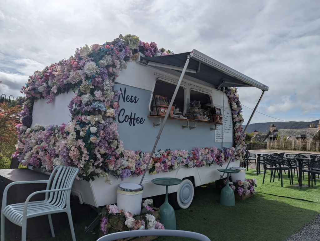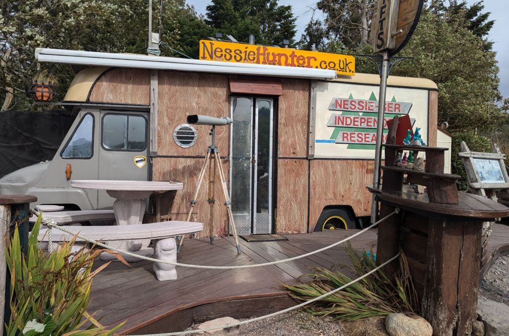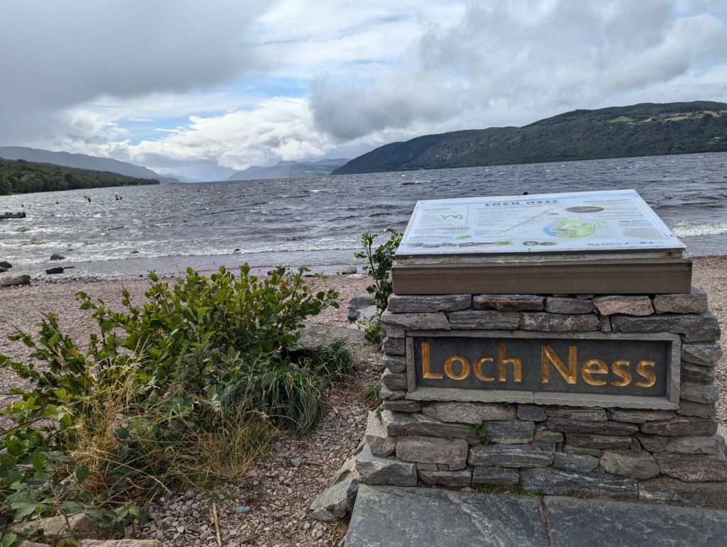 Heute führte uns die Fahrt zum legendären Loch Ness. Bei herrlichem blauen Himmel mit weißen Wolken machten wir uns auf den Weg. Am Nordufer von Loch Ness angekommen, stellte sich dann aber das erwartete schottische Schauerwetter ein. Wir stoppten am kleinen Parkplatz am Ortseingang. Nach einem kurzen Spaziergang erreichten wir das Ufer mit dem herrlichen Ausblick auf den See. Der See ist 50 km lang und bis zu 240 m tief. Ein gutes Versteck für Nessie. Zwischen den Wellen meinten wir seinen Kopf gesehen zu haben. Oder war es doch nur eine Boje? Am Ufer steht der Camper des Nessiehunter. Seid 1991 liegt er mit dem Fernrohr auf der Lauer. Sein Geld verdient er mit dem Verkauf selbstgebastelter Souvenirs. Von Touristenströmen ist heute an diesem beschaulichen Ort nichts zu spüren. Wir nehmen noch einen Kaffee an dem mit Kunstblumen verzierten kleinen Wohnwagen.
