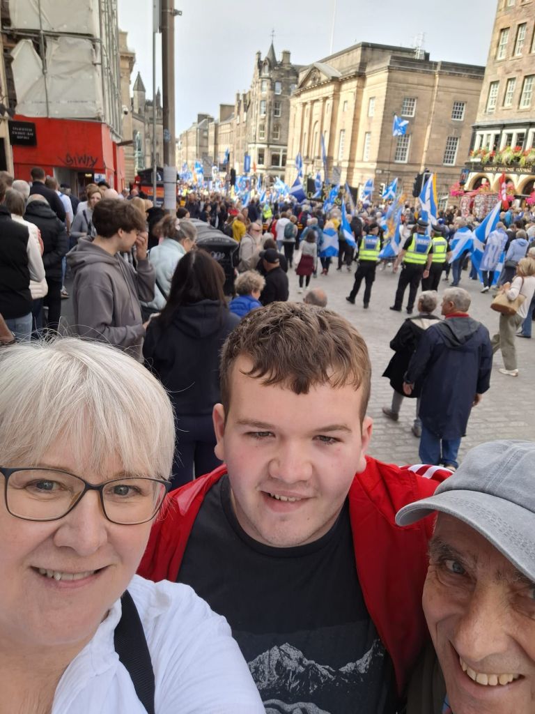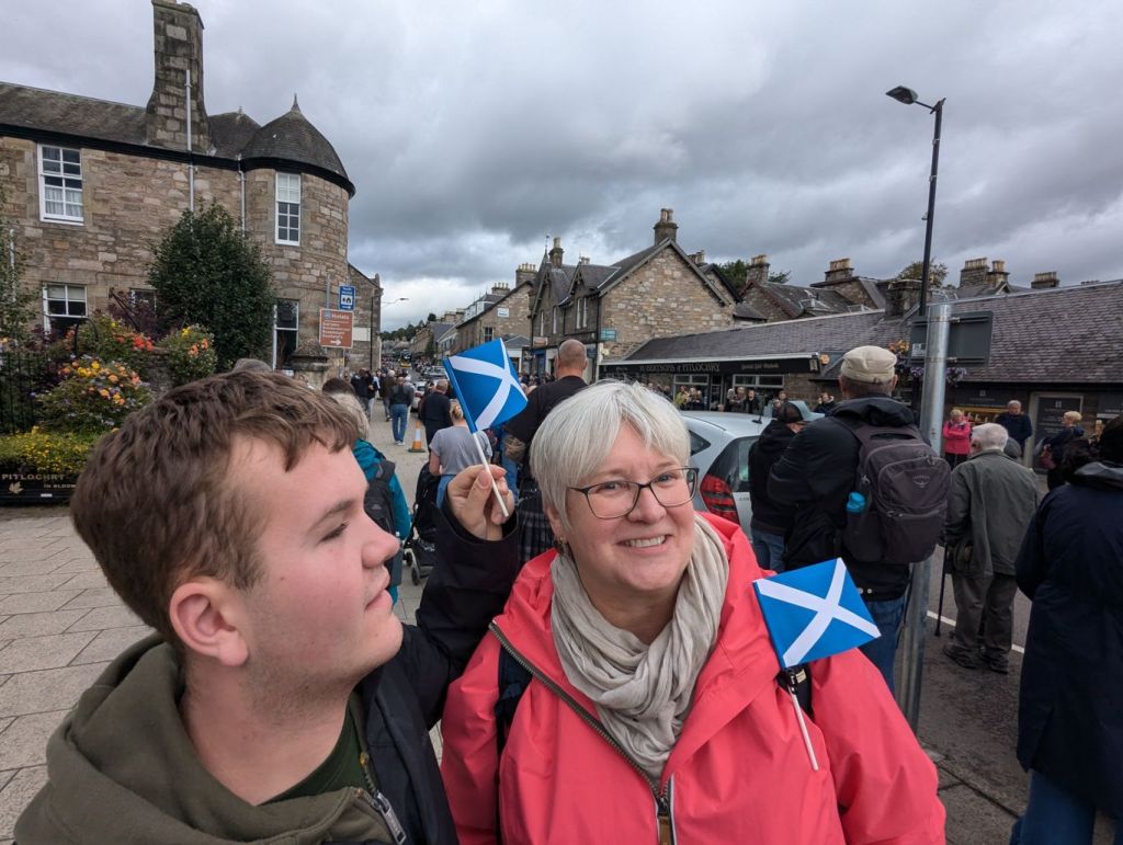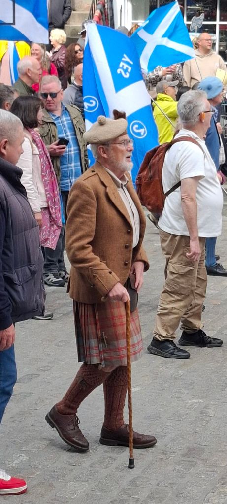 Gestern wollten wir ja Edinburgh Castle besichtigen (eigentlich nur die Aussicht genießen), aber es herrschte ein riesiger Andrang. Ich war schon hektisch dabei, Tickets online zu ordern, als Detlev daran erinnerte, dass wir solche Hotspots mit zu viel Getümmel eigentlich meiden wollten! Ein bisschen Zwiespalt war da schon zwischen „ich möchte es jetzt erleben“ und „es ist ätzend voll“. Und dann waren wir keine halbe Stunde später mitten in der schottischen Demonstration mit Motorrad-Korso, Flaggen und enthusiastischen Menschen.
