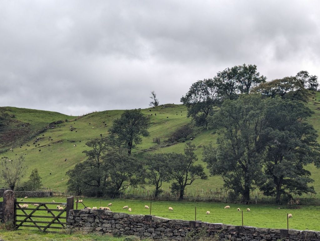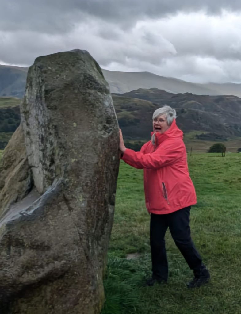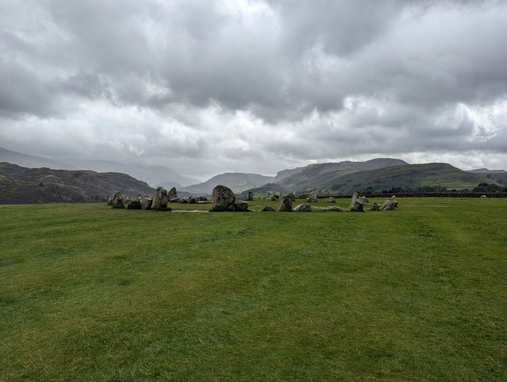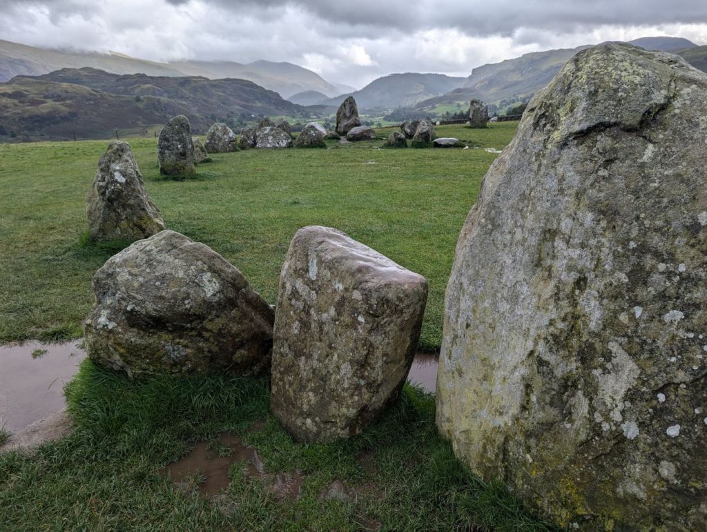 Wir haben mittlerweile Schottland verlassen und machen Zwischenstation im Lake District. Gebucht hatten wir ein altes Cottage etwas außerhalb von Clappersgate einem kleinen Ort am Windermere, England’s größtem Binnensee. Und tatsächlich es lag abseits des Ortes an einem wilden Bach, nur durch eine schmale verwachsene Straße zu erreichen. Uns gefällt es. Was uns weniger gefällt ist der Regen. Bisher waren wir durch das Wetter auf unserer Reise sehr verwöhnt. Deshalb machen wir am nächsten Tag nur einen Ausflug mit dem Auto. Die Gegend ist touristisch gut erschlossen und auch zu dieser Jahreszeit gut besucht. Traumhafte baumlose sanfte Berglandschaften durchzogen mit Natursteinmauern. Dazu die Schafe als kleine weiße Punkte die über die Landschaft verteilt sind. Unser Ziel ist heute der Steinkreis von Castlerigg. Nicht so groß wie Stonehenge, aber schön gelegen. Kein Eintritt und wieder keine Touristenströme. Ulrike ist hell auf begeistert und lehnt sich gleich an einen der Steine. Anfassen ist hier erlaubt. Outlander lässt grüßen.