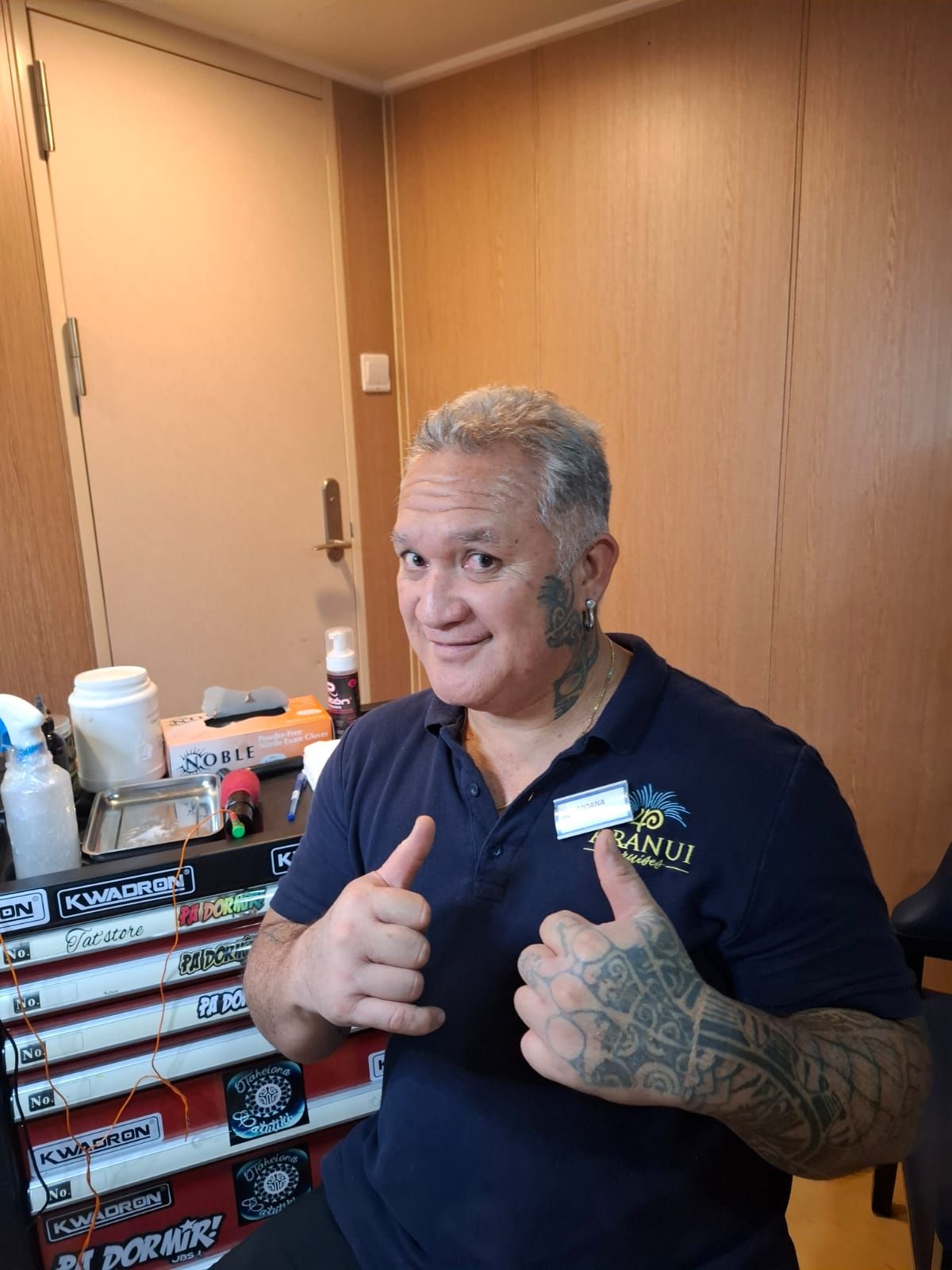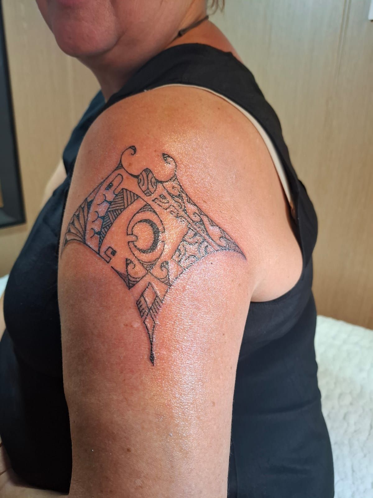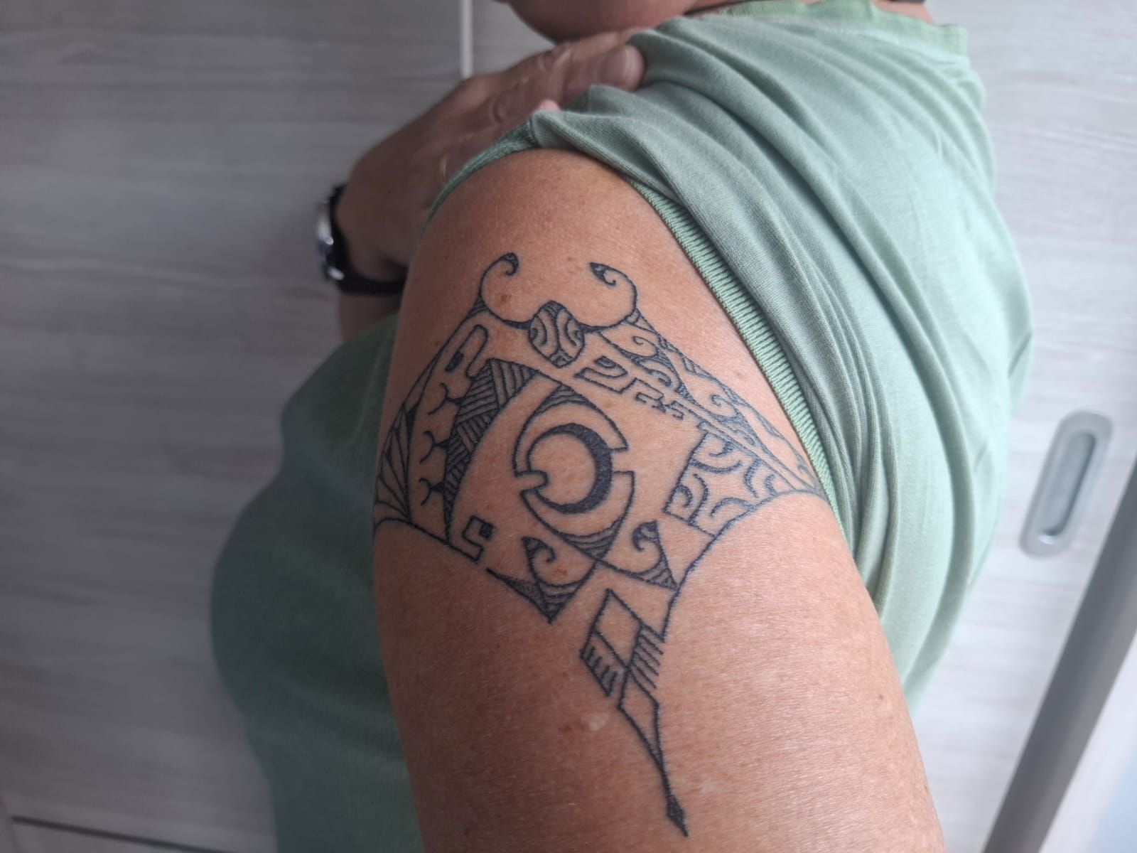 Ich wusste, dass es auf dem Schiff ein Tattoo-Studio gibt und ich hatte mich vorher schon mit Tätowierungen, eigentlich in Verbindung mit Hawaii, beschäftigt. Diese haben ihren Ursprung allerdings in französisch Polynesien. Mir war klar, dass es hier nicht um ein Bild auf der Haut geht. Eher ein Statement. Klar war einzig die Stelle: Schulter. Vielleicht hätte ich mich nicht getraut, wenn nicht Tanja, die ich auf dem Schiff kennengelernt habe, Vorreiter gewesen wäre!!! Moano, der Tätowierer, gab mir zwei Bücher (sogar in deutscher Sprache) mit vielen Bildern und Informationen. Und ich verfasste eine Aufstellung mit Dingen, die ich liebe und was mir wichtig ist. Heute und für die Zukunft. Mit dem, was dann entstanden ist, habe ich bewusst nicht viel zu tun. Da hat der Künstler in einer magischen Stunde (viel länger hat es nicht gedauert) MICH in polynesischer Sprache umgesetzt. Jede Linie hat Bedeutung, jedes einzelne Bild trifft eine Aussage. Es ist größer geworden als ich es dachte, und dennoch genau richtig. Zusammengefasst dreht es sich um Schutz, Stärke und Ausdauer, Verbundenheit, Familie, Gemeinschaft (Freunde), Harmonie, Mut, Gelassenheit, unterwegs sein, Meer(Tiefe).