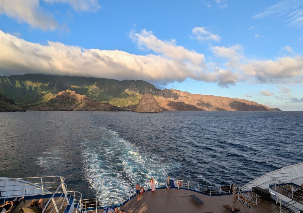 Und gerade diese Traditionen versucht die Bevölkerung der Inseln wieder aufleben zu lassen. Durch die Verbote in der damaligen Kolonialzeit gerieten viele Tänze, Lieder und Rituale in Vergessenheit. Es kam uns bei den zahlreichen Aufführungen, die wir auf der Aranui und den Inseln gesehen haben, nicht ein einziges Mal auch nur ansatzweise so vor, dass hier nur für Touristen getanzt und gesungen wird. Im Gegenteil. Mit Freude und Hingabe wurde Kultur präsentiert! Oft tanzten schon die kleinen Kinder mit. Und wenn wir Gäste zum Tanzen aufgefordert wurden, dann nicht um uns mit unseren steifen Hüften bloß zu stellen, sondern um uns in die Stimmung und die Magie mitzunehmen. Bei mir hat das geklappt. Bei den Männern auch. So mancher hat die archaischen Schreie der Polynesier aus tiefster Seele in den Abendhimmel geschrien!
